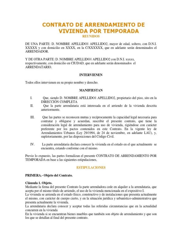 Los contratos de arrendamiento de temporada exigen que el inquilino abandone la vivienda al finalizar el contrato. Y más abajo te dejo consejos e instrucciones para que puedas firmar tu contrato con buen conocimiento de lo que firmas. Modelo de contrato de alquiler a corto plazo.