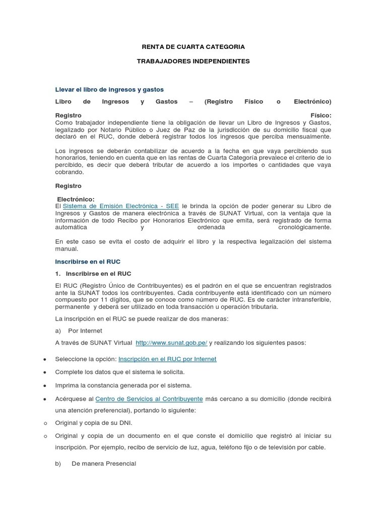 Quien suscribe, maría suarez pérez con domicilio en andador 16 departamento de acopixtla de méndez, colombia, quien con la presente atentamente le expongo: Para el calculo de renta de cuarta categoría a sus ingresos brutos se realiza un descuento del 20%, luego de ello se descuenta 7 uit y/o 3 uit y finalmente se aplica la tasas de impuesto a la renta. Las rentas de cuarta categoría corresponden a servicios prestados sin relación de dependencia, es decir, a trabajos prestados en forma independiente.