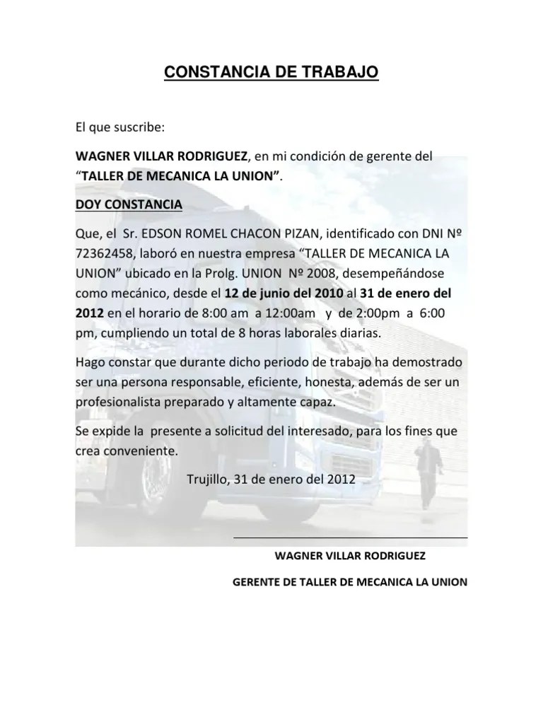 Abrir formato de certificado en una ventana nueva. El modelo de una constancia de trabajo válido actualmente debe incluir el nombre, apellido y el dni del trabajador, la fecha en la que se comenzó y finalizó el contrato laboral, el ruc y la dirección de la empresa y el puesto de trabajo que se desempeño. En estos casos es necesario que se presente una solicitud de permiso laboral para que el empleador esté al tanto y no se incumpla ninguna cláusula del contrato firmado por las partes.